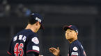 [OSEN=지형준 기자]] 27일 오후 서울 잠실야구장에서 열린 '2018 신한은행 MY CAR KBO리그' 두산 베어스와 롯데 자이언츠의 경기, 1회말 1사 1,3루에서 롯데 레일리가 두산 김재환에 희생플라이로 선취점을 내주자 한동희가 격려하고 있