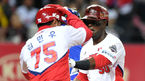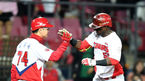 [OSEN=광주, 이대선 기자] 27일 오후 광주기아챔피언스필드에서 ‘2018 신한은행 MY CAR KBO리그’ KIA와 삼성의 경기가 열렸다.3회말 2사에서 KIA 버나디나가 중월 솔로 홈런을 치고 김종국 코치의 축하를 받고 있다./sunday@osen.co.kr