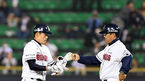 [OSEN=지형준 기자]] 27일 오후 서울 잠실야구장에서 열린 '2018 신한은행 MY CAR KBO리그' 두산 베어스와 롯데 자이언츠의 경기, 2회말 1사 1루에서 두산 허경민이 1타점 적시 2루타를 날리고 김태균 코치와 주먹을 맞대고 있다. /jpnews@os