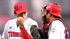 [OSEN=광주, 이대선 기자] 28일 오후 광주기아챔피언스필드에서 ‘2018 신한은행 MY CAR KBO리그’ KIA와 삼성의 경기가 열렸다.1회말 공수교대때 KIA 이민우가 더그아웃으로 가며 포수 김민식과 이야기를 나누고 있다./sunday@osen.co