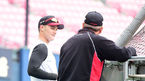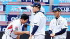 [OSEN=수원, 이동해 기자] 1일 오후 경기도 수원kt위즈파크에서 열릴 예정인 '2018 신한은행 MYCAR KBO리그' kt 위즈와 두산 베어스의 경기에 앞서 두산 오재일-조성환 코치가 kt 황재균과 이야기 나누고 있다. / eastsea@osen.co.kr