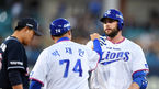 [OSEN=대구, 지형준 기자] 11일 오후 대구 삼성라이온즈파크에서 열린 '2018 신한은행 MYCAR KBO리그' 삼성 라이온즈와 두산 베어스의 경기. 1회말 1사 1,3루에서 삼성 러프가 선제 좌전 적시타를 날리고 박재현 코치와 주먹을 맞대고 있