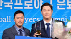 [OSEN=김성락 기자] 2일 오후 서울 강남구 호텔리베라에서 '2022 블루베리NFT 한국프로야구 은퇴선수의 날 시상식’이 열렸다.롯데 이대호가 레전드 특별상을 수상한 뒤 두산 조성환 코치와 기념촬영을 하고 있다. 2022.12.02 /ksl091