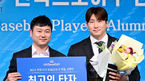 [OSEN=김성락 기자] 2일 오후 서울 강남구 호텔리베라에서 '2022 블루베리NFT 한국프로야구 은퇴선수의 날 시상식’이 열렸다.한화 김인환이 최고의 신인상을 수상한 뒤 기념촬영을 하고 있다. 2022.12.02 /ksl0919@osen.co.kr