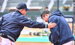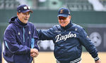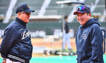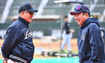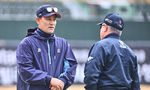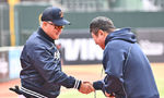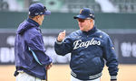 [OSEN=부산, 이석우 기자] 13일 부산 사직야구장에서 2025 신한 SOL 뱅크 KBO 리그 롯데 자이언츠와 한화 이글스의 시범경기가 열린다. 롯데 자이언츠 김민재 코치가 한화 이글스 김경문 감독과 얘기를 하고 있다. 2025.03.13 / foto0307@osen.