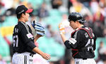 [OSEN=인천, 이대선 기자] LG는 15일 오후 인천 SSG랜더스필드에서 열린 2025 신한 SOL Bank KBO리그 SSG와 시범경기서 9-4로 이겼다.경기 종료 후 LG 김영우와 김성우가 승리의 기쁨을 나누고 있다. 2025.03.15 /sunday@osen.co.kr