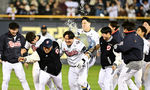 [OSEN=지형준 기자] 8일 오후 서울 잠실야구장에서 2025 신한 SOL Bank KBO리그 두산 베어스와 한화 이글스의 경기가 열렸다.이날 두산은 최승용, 한화는 문동주를 선발로 내세웠다.연장 11회말 1사 1루에서 두산 조수행이 번트 안타를