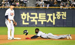 [OSEN=지형준 기자] 9일 오후 서울 잠실야구장에서 2025 신한 SOL Bank KBO리그 두산 베어스와 한화 이글스의 경기가 열렸다.이날 두산은 콜 어빈, 한화는 폰세를 선발로 내세웠다.7회초 1사 1루에서 한화 플로리얼이 2루 도루에 성공하