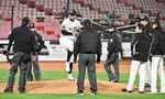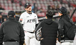 [OSEN=수원, 박준형 기자] 9일 수원KT위즈파크에서 ‘2025 신한 SOL BANK KBO리그’ KT 위즈와 NC 다이노스의 경기가 진행됐다.이날 경기에서 KT는 헤이수스를, NC는 로건을 선발투수로 내세웠다.4회초 하체 통증을 느낀 KT 선발투수 헤이