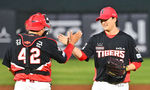 [OSEN=수원, 박준형 기자] KT가 투타 조화를 앞세워 연승을 달렸다.KT는 9일 수원KT위즈파크에서 열린 ‘2025 신한 SOL BANK KBO리그’ NC와의 대결에서 4-1로 승리했다.경기종료 후 KT 장성우와 박영현이 하이파이브를 하고 있다. 202