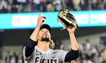 [OSEN=고척, 박준형 기자] LG 트윈스가 10일 서울 고척스카이돔에서 열린 키움과의 원정 경기에서 7-2로 승리했다. 이날 승리로 LG는 시즌 12승째(2패)를 올리며 1위 자리를 지켰다.경기종료 후 승리투수가 된 LG 임찬규가 동료들과 함