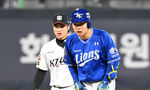 [OSEN=수원, 이대선 기자] 11일 오후 수원 KT위즈파크에서 2025 신한 SOL Bank KBO리그 KT 위즈와 삼성 라이온즈의 경기가 열렸다.7회초 무사 1루에서 삼성 김헌곤이 자신의 타구에 맞고 고통스러워하고 KT 김민수의 상태를 지켜보고 있