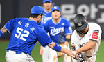 [OSEN=수원, 이대선 기자] 11일 오후 수원 KT위즈파크에서 2025 신한 SOL Bank KBO리그 KT 위즈와 삼성 라이온즈의 경기가 열렸다.5회말 2사 1루에서 1-2루간 런다운에 걸린 KT 1루주자 강백호가 삼성 박병호에게 태그아웃 되고 있다. 2025.04.