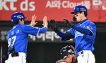 [OSEN=수원, 이대선 기자] 11일 오후 수원 KT위즈파크에서 2025 신한 SOL Bank KBO리그 KT 위즈와 삼성 라이온즈의 경기가 열렸다.6회초 1사에서 삼성 구자욱이 중월 솔로 홈런을 치고 홈에서 강명구 코치와 환호하고 있다. 2025.04.11 /sunday