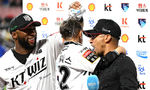 [OSEN=수원, 이대선 기자] KT 위즈가 삼성 라이온즈를 제압했다.KT는 11일 수원 KT위즈파크에서 열린 2025 신한 SOL뱅크 KBO리그 삼성과의 홈 경기에서 5-3으로 승리했다.경기 종료 후 KT 로하스와 헤이수스가 첫 승을 거둔 쿠에바스에게