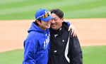 [OSEN=수원, 김성락 기자] 12일 오후 수원 KT위즈파크에서 ‘2025 신한 SOL Bank KBO리그’ KT 위즈와 삼성 라이온즈의 경기가 열렸다.홈팀 KT는 문용익, 원정팀 삼성은 레예스를 선발로 내세웠다. 경기 시작에 앞서 KT 이강철 감독, 쿠에