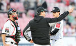 [OSEN=수원, 김성락 기자] 24일 오후 수원 KT위즈파크에서 ‘2025 신한 SOL Bank KBO리그’ KT 위즈와 SSG 랜더스의 경기가 열렸다.홈팀 KT는 강건, 원정팀 SSG는 문승원을 선발로 내세웠다. 2회초 1사 만루 KT 마운드를 방문한 제춘모 투수