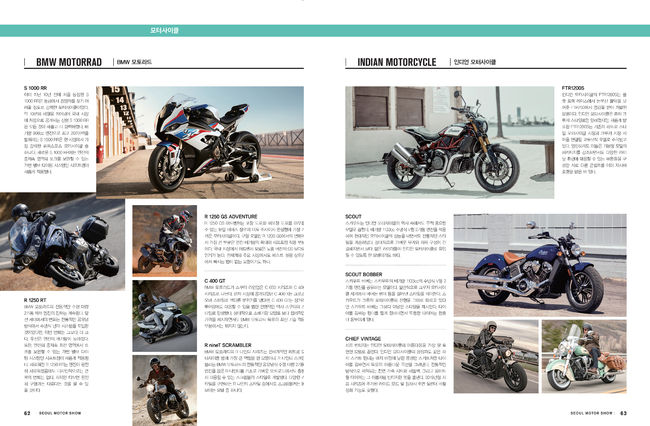 2장 모터사이클 편은 BMW모토라드, 인디언 모터사이클, 혼다 모터사이클, 가와사키 중공업, 트랑엄프 모터사이클 등 참가 모터사이클 브랜드의 출품모델을 소개한다. 3장은 전기차와 캠핑카, 부품 치 용품, 공동관, 기타 정보를 담았다.