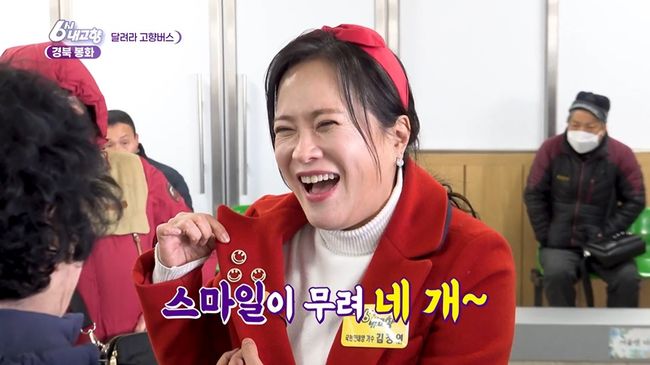 ‘6시 내고향-달려라 고향버스’ 국민안내양 가수 김정연이 올해 첫 스마일 미션에 성공하며 네 번째 스마일 배지를 획득했다,