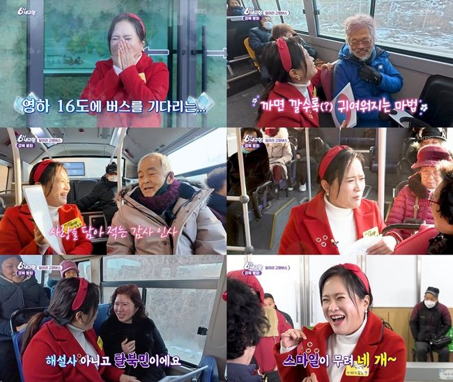 27일 방송된 KBS1 ‘6시 내고향-달려라 고향버스’에서는 경상북도 봉화군의 버스에 올라 이웃들의 인생사를 만나보는 ‘국민 안내양’ 김정연의 모습이 담겼다. 한파 특보가 내려진 이 날의 기온은 무려 -16°로 전국 방방곡곡을 누벼온 김정연도 추위 앞에 어쩔 줄을 모르는 모습이었지만, 특별한 사연을 품은 승객들과의 인터뷰로 버스 안의 온도는 어느 때보다 훈훈했다.