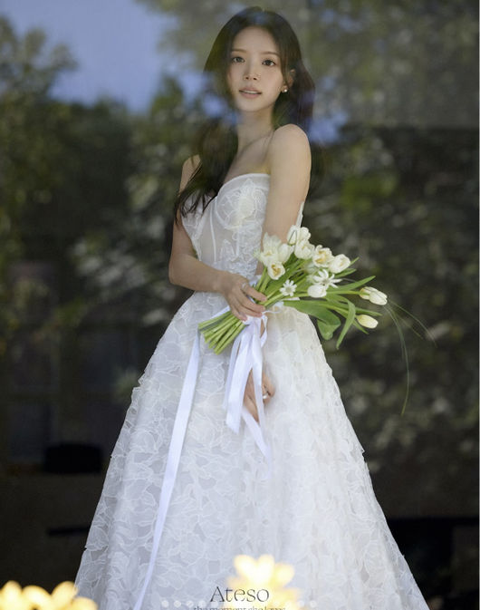 공개된 사진 속 김지영은 화이트 웨딩드레스를 입고 청초한 분위기를 뽐내고 있다. 한 컷에서는 야외 자연광 속에서 부케를 들고 서 있는 모습으로, 단아하면서도 우아한 신부 자태가 돋보인다. 레이스 디테일이 돋보이는 드레스와 길게 늘어진 리본, 화사한 화이트 부케가 어우러지며 로맨틱한 무드를 완성했다.
