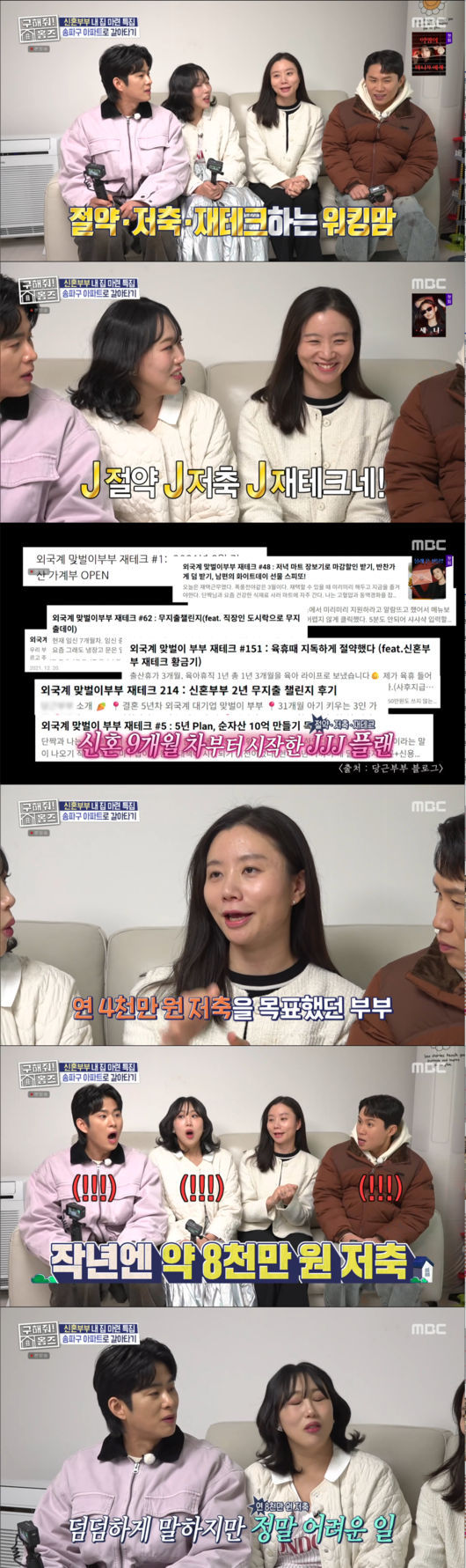 송파에 자가를 보유하고 있는 결혼 7년 차 신혼부부의 집을 방문해 그들의 일상을 들여다봤다. 이날 등장한 아내는 자신을 “절약, 저축 재테크하고 있는 워킹맘이다”라고 소개하며, 현재 순자산이 10억 원에 달한다는 사실을 밝혀 주위를 놀라게 했다.