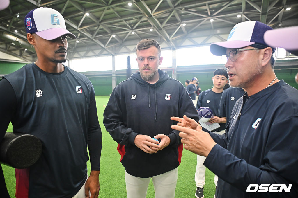 롯데 새 외국인 투수 로드리게스, 비슬리가 김상진 코치와 얘기하고 있다. 2026.01.31 / foto0307@osen.co.kr