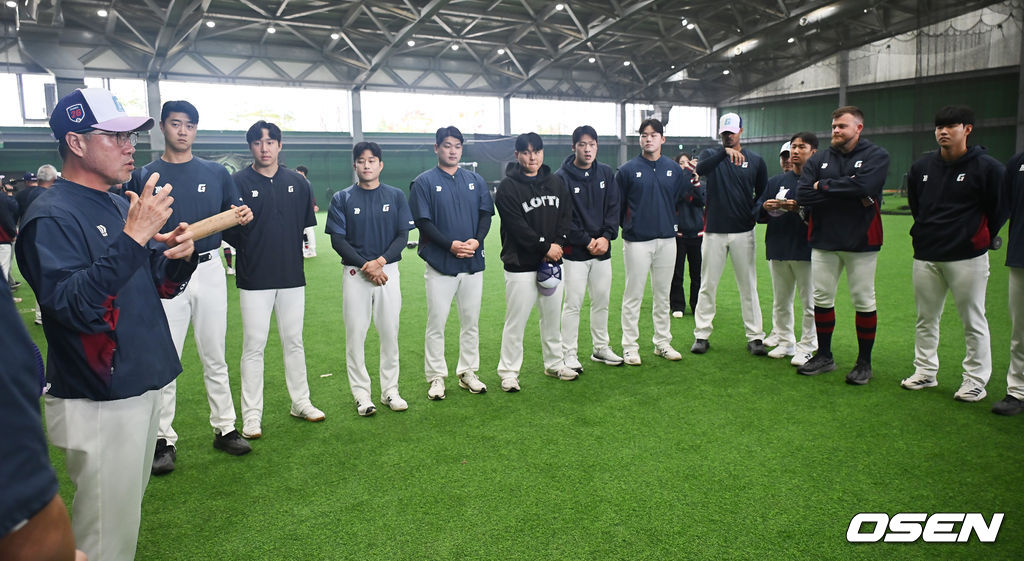 롯데 김상진 코치가 투수조들에게 훈련에 대해 얘기하고 있다. 2026.01.31 / foto0307@osen.co.kr