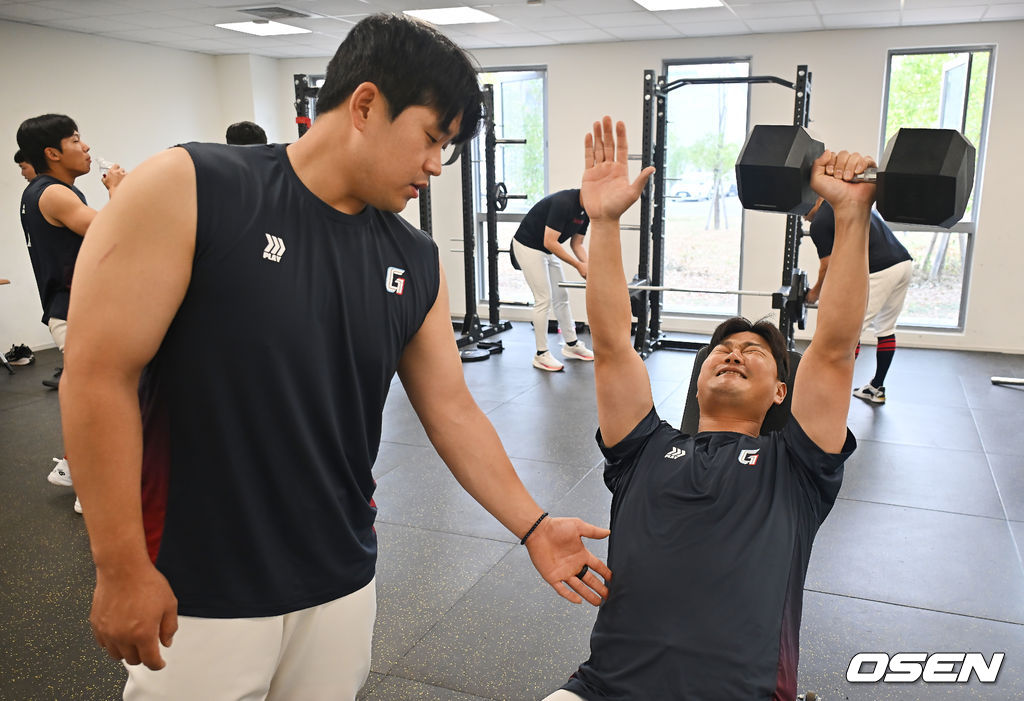 롯데 손호영이 유강남의 도움을 받으며 웨이트를 하고 있다. 2026.01.31 / foto0307@osen.co.kr