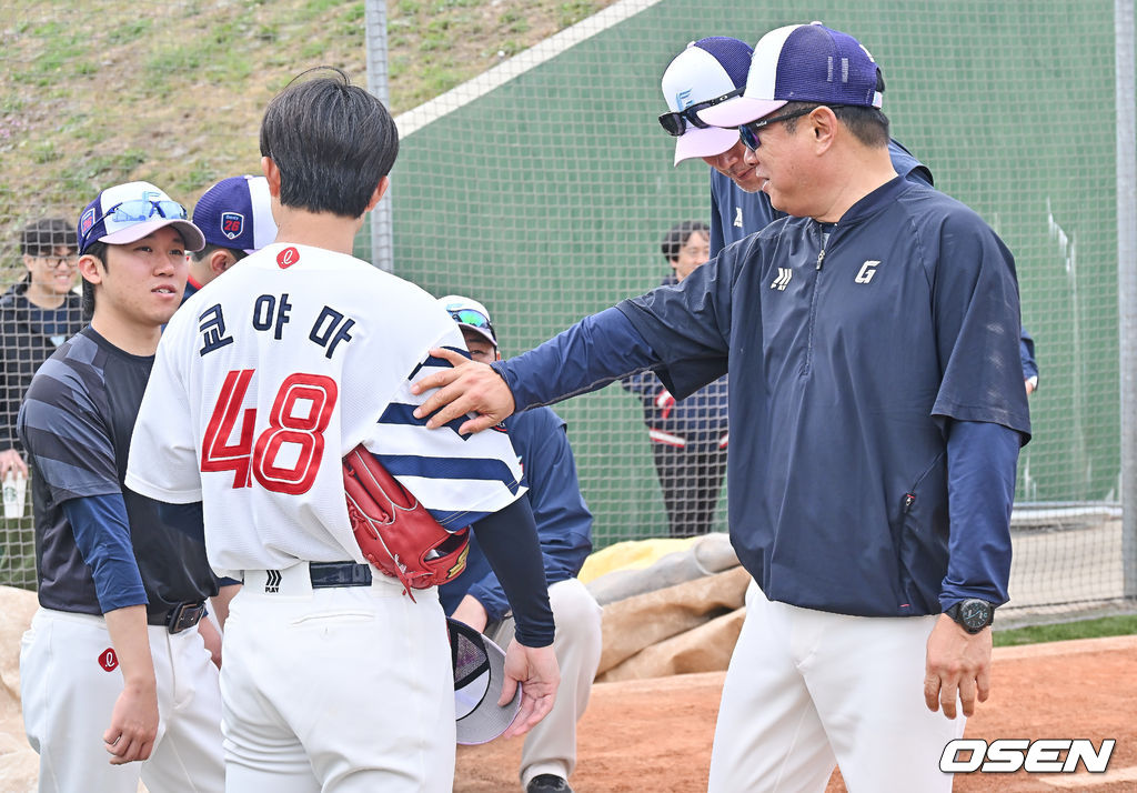 롯데 김태형 감독이 불펜투구를 마친 쿄야마 투수와 얘기하고 있다. 2026.02.01 / foto0307@osen.co.kr