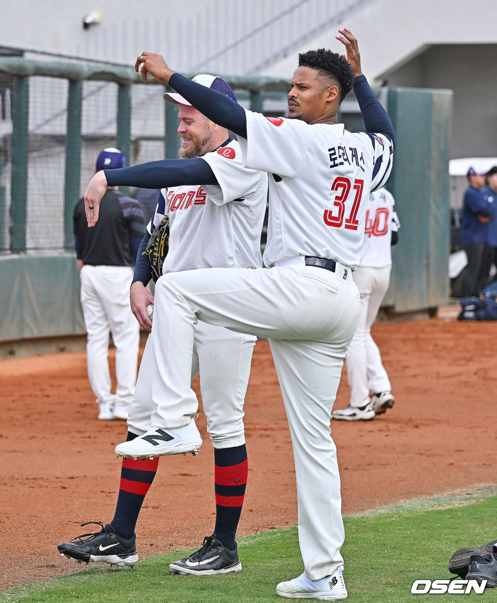 롯데 새 외국인 투수 비슬리와 로드리게스가 투구 동작에 대해 얘기를 하고 있다. 2026.02.01 / foto0307@osen.co.kr