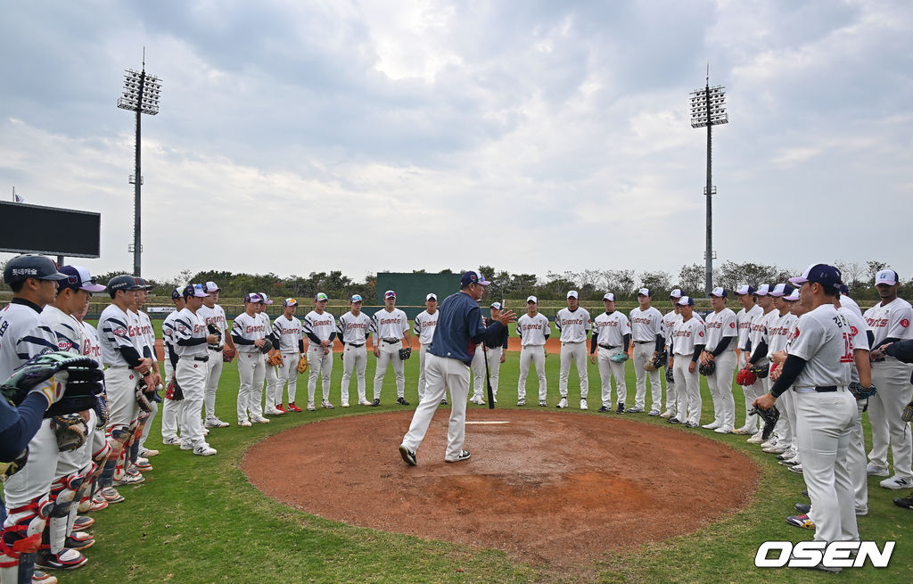 롯데 선수들이 수비 훈련을 위해 문규현 코치의 설명을 듣고 있다. 2026.02.01 / foto0307@osen.co.kr