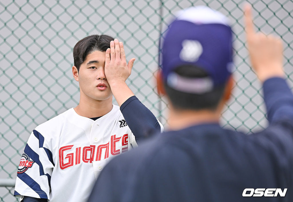 롯데 김기준이 이재율 코치와 주시안 테스트를 하고 있다. 2026.02.01 / foto0307@osen.co.kr