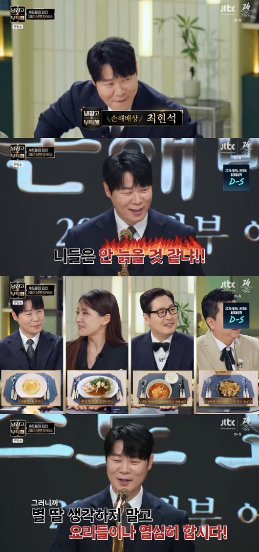 중간에 특별상도 시상했다. 안정환은 “지금부터 특별상 시상하겠다”라며 가장 먼저 ‘손해배상’으로 최현석을 언급했다. 요리 중 소금 테러로 ’손해배상’ 수상을 받게 된 것.