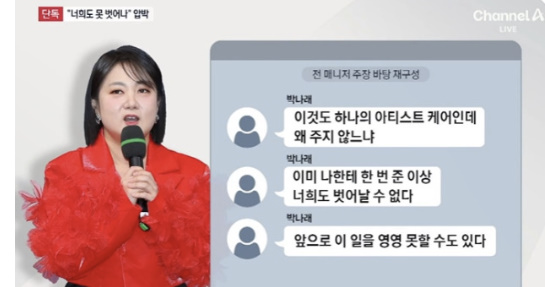 전 매니저 측에 따르면 박나래는 특정 약을 대리 처방해 달라고 요구했고, 이에 응하지 않자 “이것도 하나의 아티스트 케어인데 왜 주지 않느냐”,“이미 한 번 준 이상 너희도 벗어날 수 없고 앞으로 이 일을 영영 못할 수도 있다”는 취지의 압박성 메시지를 보냈다는 주장이다.