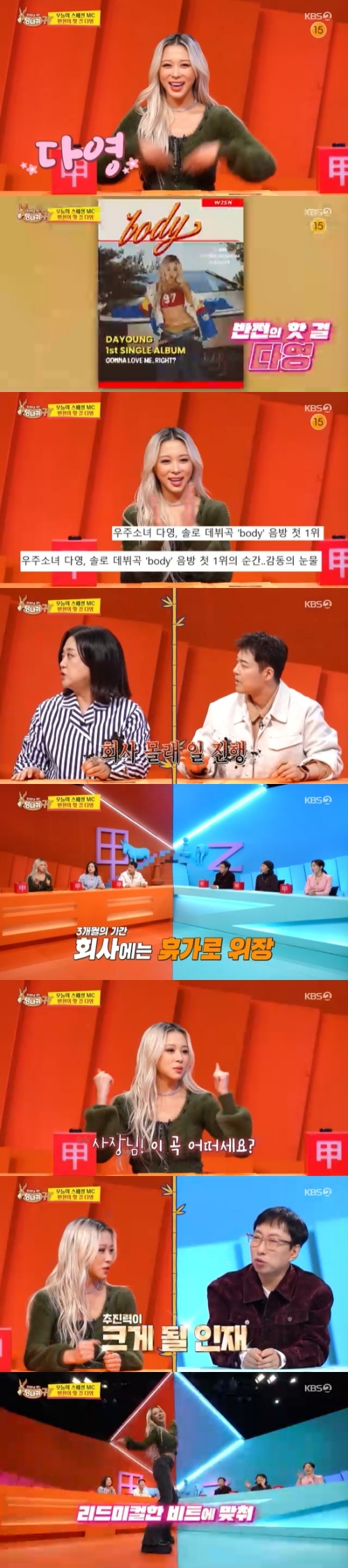 14일 오후 방송된 KBS2 예능 '사장님 귀는 당나귀 귀'(이하 사당귀)에서는 엄지인 아나운서, 탈북민 출신 CEO 이순실 등의 에피소드가 공개됐다. 스페셜 MC로 우주소녀 다영이 출격했다.