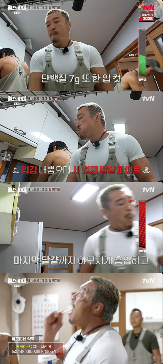 마지막 다섯 번째 달걀까지 깔끔하게 비워낸 추성훈은 아모띠가 건넨 크레아틴까지 챙겨 먹으며 철저한 자기관리의 정석을 보여줬다.