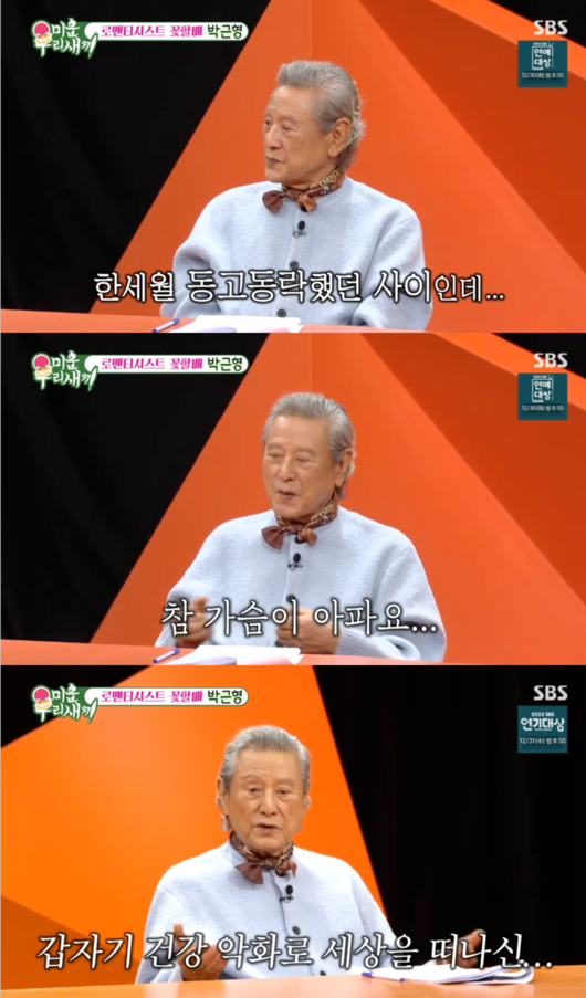 가장 안타까운 점은 갑작스러운 이별이었다. 박근형은 “갑자기 어느 날 몸이 불편하다고 병원에 가시고 나서 뵙지도 못하고 돌아가셨다. 마지막에 얼굴을 뵙지 못한 게 너무나 서운하고 마음이 아프다”며 고인의 마지막 길을 배웅하지 못한 속상함을 토로했다.