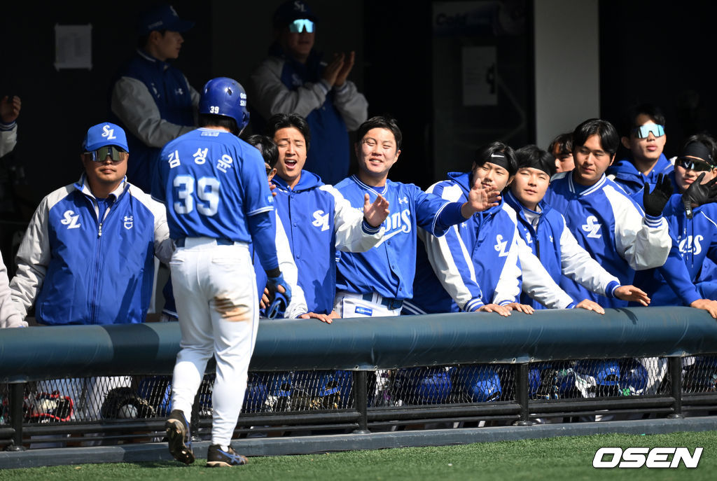 3회초 2사 만루에서 삼성 함수호의 우전 2타점 적시 2루타 때 홈을 밟은 김성윤이 더그아웃에서 환호하고 있다. 2026.03.14 /sunday@osen.co.kr