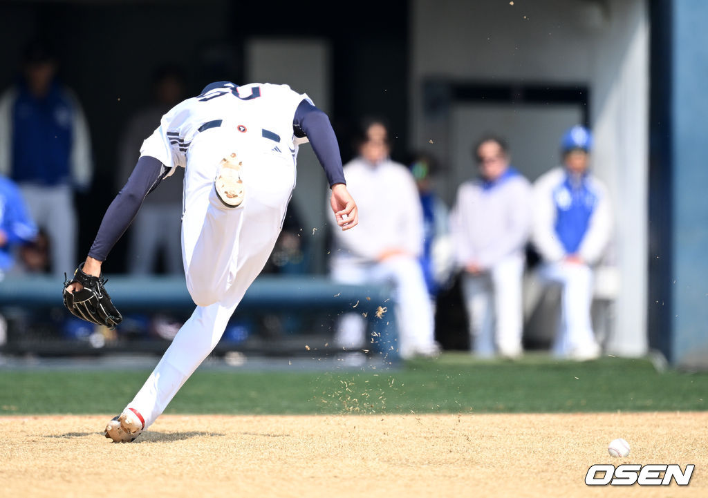 3회초 무사 1루에서 두산 이영하가 삼성 김성윤에게 번트 안타를 허용하고 있다. 2026.03.14 /sunday@osen.co.kr