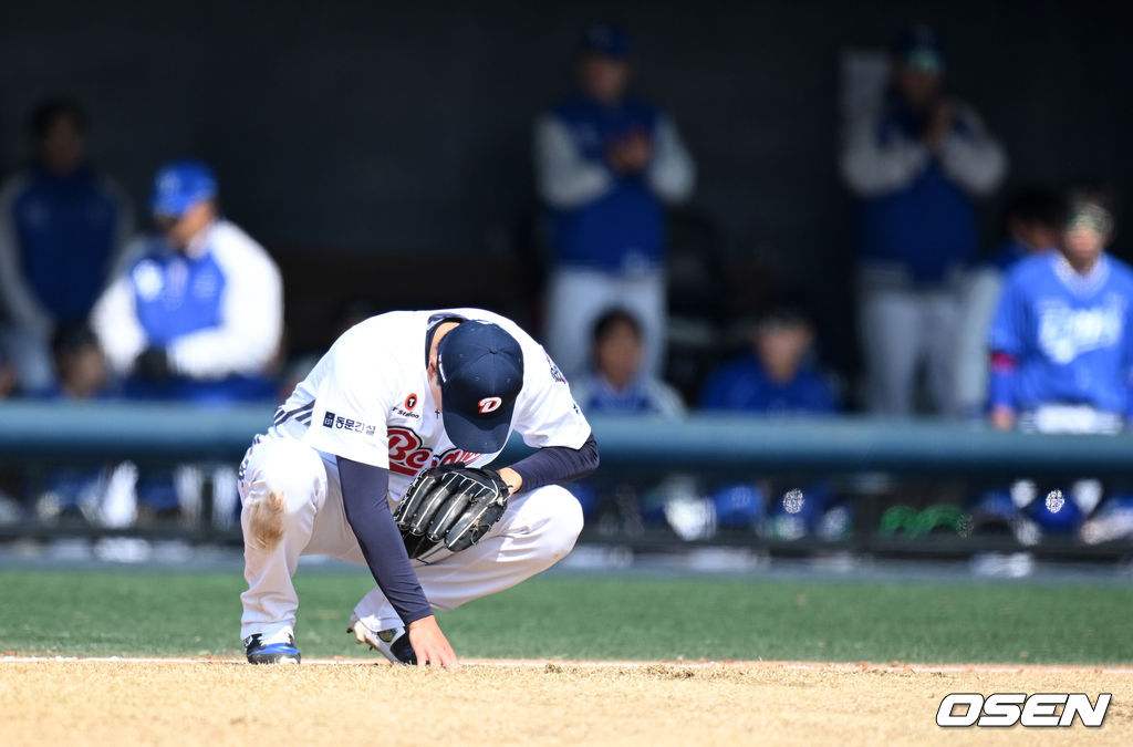 3회초 무사 1루에서 두산 이영하가 삼성 김성윤에게 번트 안타를 허용하고 아쉬워하고 있다. 2026.03.14 /sunday@osen.co.kr