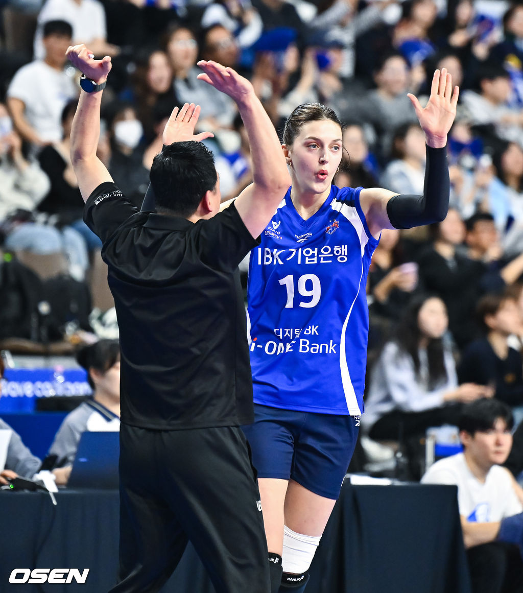2세트 IBK기업은행 빅토리아가 득점 후 여오현 감독 대행과 하이파이브를 하고 있다. 2026.03.14 / soul1014@osen.co.kr
