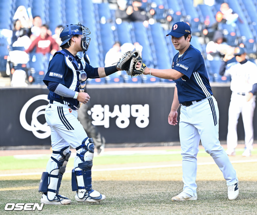 경기종료 후 두산 윤준호 포수와 김명신이 승리의 기쁨을 나누고 있다. 2026.03.17 / soul1014@osen.co.kr