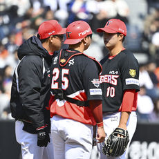 2026.03.20 14: 13김태형 제구 난조에 마운드 방문한 이동걸 코치